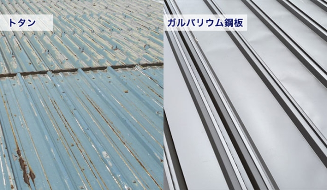 ガルバリウム鋼板とトタンは、主に金属屋根や外壁に使われる素材で、どちらも軽量で加工しやすいのが特徴ですが、最大の決定的な違いは、表面のめっき成分による「錆びにくさと耐久性」です。ガルバリウム鋼板はトタンの約3〜6倍の耐食性(錆びにくさ)を持ち、寿命も長いため、現在の住宅ではガルバリウムが主流です。